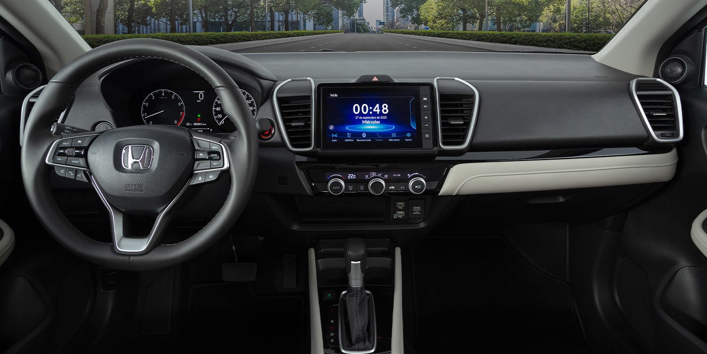 El Honda City 2026 versión Touring y Prime cuenta con un sistema Display Audio de 8 bocinas de alta resolución, pantalla táctil y compatible con funciones de Smartphone, Weblink para sincronizar funciones y aplicaciones desde tu celular y reproductor de archivos MP3 y WMA® con Apple Carplay® & Android Auto™ inalámbricos.