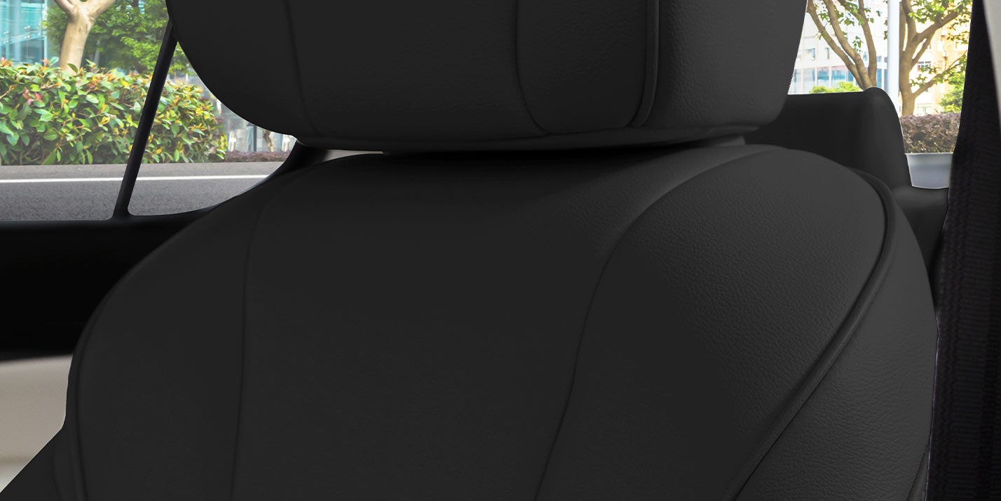 Su volante y palanca están forrados con piel y sus vestiduras de asientos con piel sintética; el asiento del conductor cuenta con ajuste manual de seis vías, además de contar con cabeceras ajustables para el conductor y copiloto.